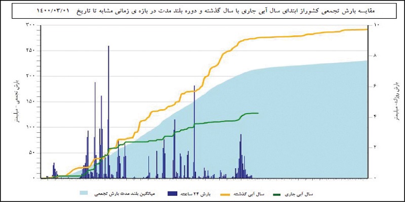بررسی گزارش‌های پژوهشکده اقلیم‌شناسی کشور توسط همشهری مشخص کرد، بارش‌ نزولات جوی در سال آبی جاری تا ابتدای خردادماه جاری، ۴۱ درصد نسبت به دوره مشابه بلندمدت و ۵۳ درصد نسبت به سال گذشته کاهش یافته است. هیچ‌یک از استان‌های کشور نیز طی این دوره، بارش بیش از نرمال دریافت نکرده‌اند. در سال آبی‌ ۱۴۰۰-۱۳۹۹، بیشترین کم‌بارشی به‌ترتیب در استان‌های هرمزگان، سیستان و بلوچستان و کرمان با ۸۶-، ۸۲- و ۶۵- درصد رخ داد. بدین‌ترتیب در ۴ ماه آینده، از همین حالا یعنی خرداد تا شهریورماه سال‌جاری، بارش‌ها در استان‌های واقع در ۲ سوی البرز مرکزی و شمال‌غرب در حد نرمال و سایر مناطق به استثنای بخش محدودی در جنوب‌شرق کشور قابل توجه نیست. مدل‌های اقلیمی پژوهشکده اقلیم‌شناسی کشور درباره بارش‌ نزولات جوی در دوره خرداد تا شهریور ۱۴۰۰نشان می‌دهد طی این مدت، بارش در استان‌های ساحلی خزر و شمال‌غرب کشور نرمال تا اندکی کمتر از آن و در دیگر مناطق کشور مطابق فصل در محدوده صفر میلی‌متر باشد. مقدار بارش موسمی تابستانه در مناطق جنوب و جنوب‌شرق نیز به بیش از نرمال گرایش دارد.