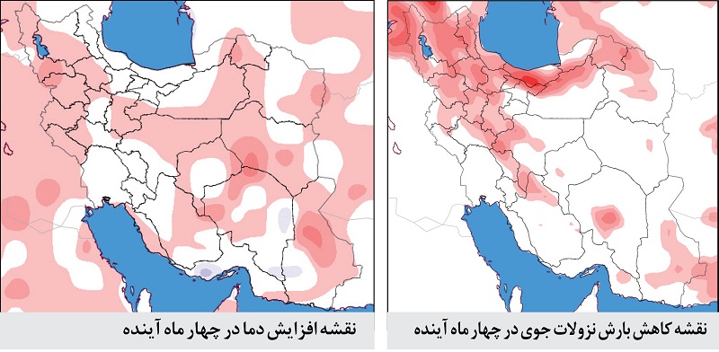 نقشه پیش‌بینی بی‌هنجاری دمای پژوهشکده اقلیم‌شناسی کشور از وضعیت ۴‌ ماه آینده نشان می‌دهد، بیشترین افزایش دما در منطقه کویری استان‌های یزد و کرمان، سیستان‌ و بلوچستان، فارس، خراسان شمالی، آذربایجان‌غربی و کردستان رخ می‌دهد. بخش قابل‌توجهی از استان‌های مرکزی، غربی و شرقی نیز با افزایش دمای کمتر مواجه خواهند شد. همچنین نقشه پیش‌بینی بی‌هنجاری بارش ۴ ماه آینده نیز مشخص می‌کند همه استان‌های البرزی و زاگرسی با کاهش چشمگیر بارش تا پایان تابستان ۱۴۰۰ مواجه باشند که در این میان، سهم استان مازندران بیشتر از همه نقاط کشور خواهد بود./همشهری