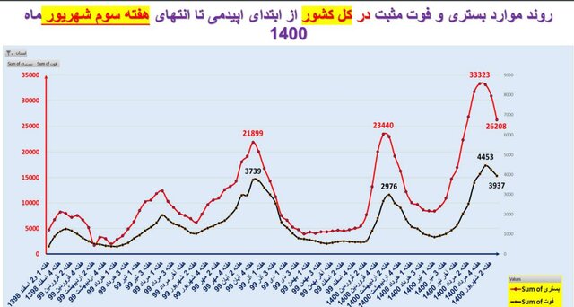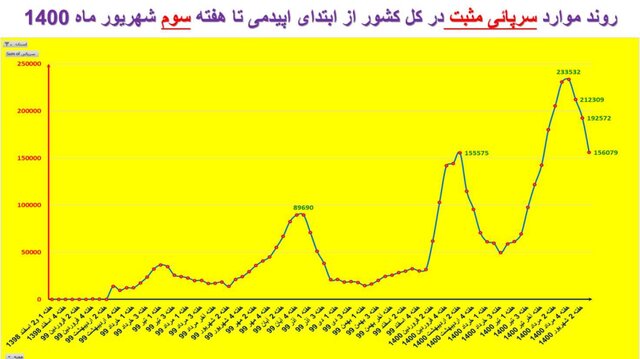 در کشورمان از ۱۲ تا ۱۸ شهریور ماه مقارن با هفته ۸۱ اپیدمی در کشور، تعداد موارد مثبت شناسایی شده، ۱۵۶۰۷۹ مورد بوده است، همچنین تعداد موارد بستری جدید ۲۶۲۰۸ مورد بوده و متاسفانه طی این مدت در کشور ۳۹۳۷ نفر جان باختهاند.