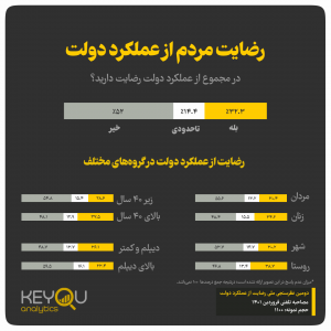 میزان رضایت از عملکرد دولت در ساکنین روستا بیش از ساکنین شهرهای کشور است. همچنین زنان بیش از مردان از عملکرد دولت رضایت دارند. در مقابل، افراد زیر ۴۰ سال به طور معناداری کمتر از افراد بالای ۴۰ سال از عملکرد دولت رضایت داشتهاند. افراد دارای تحصیلات دانشگاهی نیز کمتر از افرادی که فاقد تحصیلات دانشگاهی هستند از عملکرد دولت رضایت دارند.