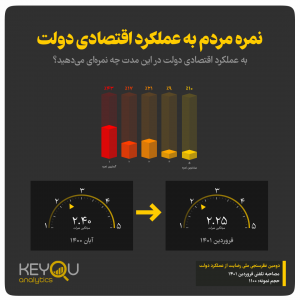 از پاسخگویان خواسته شد تا به عملکرد اقتصادی دولت نمرهای بین یک تا پنج بدهند که یک به معنای کمترین نمره و ۵ بیشترین نمره محسوب خواهد شد. میانگین نمرات پاسخگویان در فروردین ماه سال ۱۴۰۱ برابرا با ۲.۲۵ بوده است. این رقم در آبان ۱۴۰۰، یعنی ۱۰۰ روز پس از روی کار آمدن دولت، برابر با ۲.۴ بوده است.