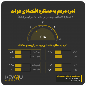 در حالی که میانگین نمره پاسخگویان به عملکرد اقتصادی دولت در بازه یک تا پنچ برابر با ۲.۲۵ بوده است، تحلیل یافتههای پژوهش نشان میدهد این رقم در بین گروههای مختلف متفاوت است. بر این اساس میانگین نمره پاسخگویان به عملکرد اقتصادی دولت، در بین افراد دارای تحصیلات دانشگاهی کمتر از سایر گروهها است. همچنین افراد زیر ۴۰ سال، مردان و ساکنین روستا، نسبت به گروههای مقابلشان، نمره کمتری به عملکرد اقتصادی دولت دادهاند.