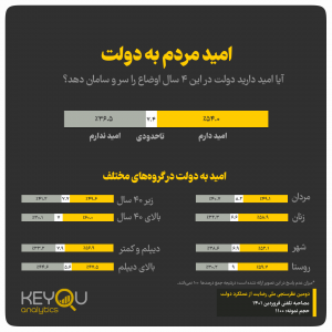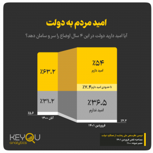 ۵۴ درصد از پاسخگویان گفتهاند که امید دارند دولت در ۴ سال پیشرو اوضاع کشور را سروسامان دهد. حدود ۳۶ درصد از پاسخگویان نیز اعلام کردهاند که امیدی به سروسامان دادن اوضاع کشور توسط دولت نیستند. میزان ناامیدی در آبان ماه ۱۴۰۰ یعنی ۱۰۰ روز پس از روی کار آمدن دولت سیزدهم، حدود ۳۲ درصد بوده است.