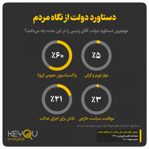 از مخاطبان این نظرسنجی خواسته شد تا مهمترین دستاور دولت را از بین ۴ گزینهای که برای آنها خوانده میشود بیان کنند. ۶۰ درصد از پاسخگویان، واکسیناسیون عمومی را مهمترین دستاورد دولت سیزدهم دانستهاند. ۲۱ درصد از پاسخگویان نیز به تلاش دولت برای اجرای عدالت اشاره کرده و مهار تورم و موفقیت در سیاست خارجی به ترتیب توسط ۵ و ۳ درصد از پاسخگویان مورد اشاره قرار گرفته است. شایان ذکر است که حدود ۱۱ درصد از پاسخگویان، هیچیک از این ۴ مورد را دستاورد دولت سیزدهم نداستهاند.