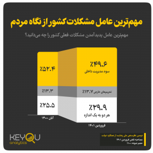 حدود نیمی از پاسخگویان به نظرسنجی کیو، سوء مدیریت داخلی را مهمترین عامل پدیدآمدن مشکلات کشور دانستهاند. این نسبت در آبان ماه ۱۴۰۰ نیز حدود ۵۲ درصد بوده است. در مقابل تنها حدود ۱۴ درصد از پاسخگویان به نظرسنجی، تحریمهای خارجی را مهمترین عامل پدیدآمدن مشکلات کشور عنوان کردهاند.