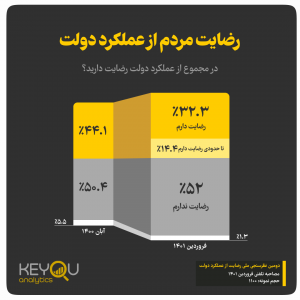 نیمی از پاسخگویان، ناراضی از عملکرد دولت سیزدهم. یافتههای این نظرسنجی ملی نشان داد همانند آبان ۱۴۰۰ حدود نیمی از پاسخگویان از عملکرد دولت سیزدهم رضایت نداشتهاند. در حالی که در آبان ۱۴۰۰ حدود ۴۴ درصد از افراد از عملکرد ۱۰۰ روزۀ دولت رضایت داشتهاند، در فروردین ۱۴۰۱ حدود ۳۲ درصد از پاسخگویان نسبت به عملکرد دولت ابراز رضایت کردهاند و ۱۴.۴ درصد از پاسخگویان موضعی بینابین داشتهاند و نسبت به عملکرد دولت سیزدهم تاحدودی رضایت داشتهاند. در مجموع میتوان چنین نتیجه گرفت که میزان نارضایتی از عملکرد دولت سیزدهم تغییر محسوسی نداشته و همچنان حدود نیمی از افراد از آن ناراضیاند.