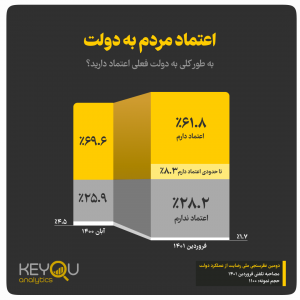حدود ۶۲ درصد از پاسخگویان به نظرسنجی کیو، اعلام کردهاند که به طور کلی به دولت اعتماد دارند. این رقم در آبان ۱۴۰۰ نیز حدود ۷۰ درصد بوده است. در تفسیر این نتیجه باید در نظر داشت که اعتماد به دولت، شاخصی فراگیر تر از رضایت یا عدم رضایت را در برمیگیرد. لذا افراد میتوانند به دولت اعتماد داشته باشند ولی از عملکرد آن راضی نباشند.