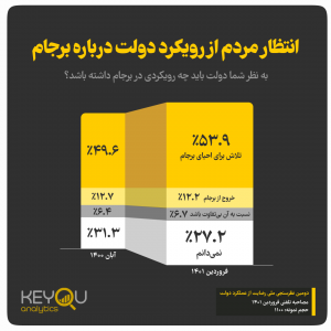 در آبان ۱۴۰۰، حدود نیمی از پاسخگویان به نظرسنجی کیو گفتهاند که دولت باید برای احیای برجام تلاش کند. این رقم در فروردین ماه ۱۴۰۱ نیز حدود ۵۴ درصد بوده است. همچنین همانند آبان ماه سال گذشته، حدود ۱۲ درصد از پاسخگویان بیان کردهند که دولت باید از برجام خارج شود و حدود ۶ درصد نیز بیتفاوتی نسبت به سرنوشت برجام را رویکرد مناسب دولت دانستهاند.