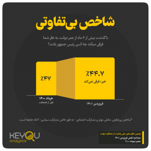 شاخص بی تفاوتی در خردادماه ۱۴۰۰ یعنی پیش از برگزاری انتخاب ریاست جمهوری نیز برابر با ۴۷ درصد بوده است. در تحلیل این شاخص باید در نظر داشت که شاخص بیتفاوتی عاملی موثر بر مشارکت اجتماعی و به طور خاص مشارکت سیاسی یکایک آحاد جامعه است./انتخاب
