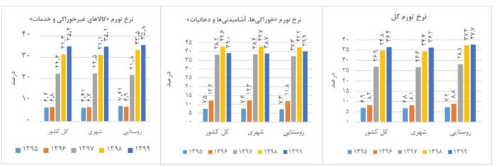 نرخ تورم گروه عمده «کالاهای غیر خوراکی و خدمات» در سال ١٣٩٩ برای کل کشور ۳۵.۲ درصد، مناطق شهری ٣۵.١ درصد و مناطق روستایی ٣۵.٨ درصد بوده است.