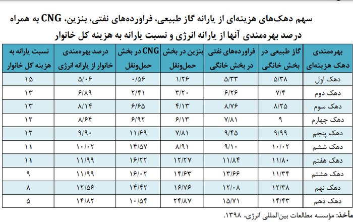 طبق دیدگاه کارشناسان، میزان یارانه پرداختی به صورت پنهان بسیار بیشتر از یارانه نقدی و آشکار است. پس در مجموع افراد ثروتمند یا سه دهک بالای جامعه به مراتب یارانه‌ای بیشتر از افراد ضعیف و دهک‌های پایین دریافت می‌کنند. در جدول زیر میزان بهره‌مندی دهک‌های هزینه‌ای از یارانه پنهان بخش انرژی آمده است. دهک اول که پایین‌ترین هزینه را دارد از ۵.۰۶ درصد و دهک دهم از ۱۴.۸۲ درصد یارانه انرژی بهره مند هستند.