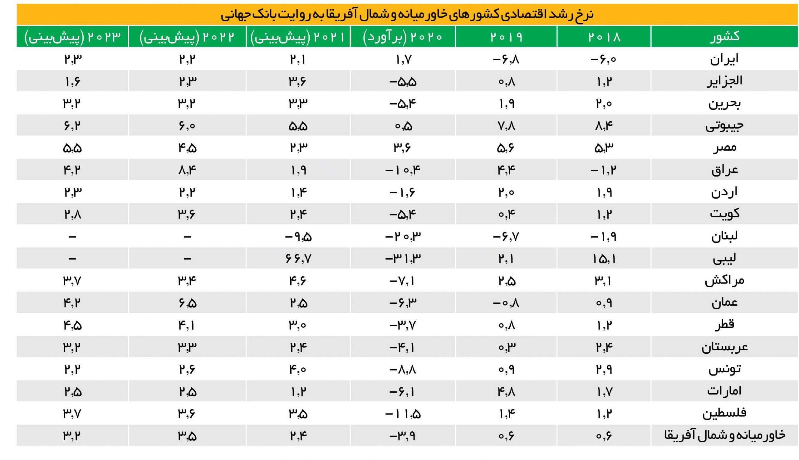 برآوردهای اولیه بانک جهانی حاکی است تولید ناخالص داخلی کشورهای خاورمیانه و شمال آفریقا در سال۲۰۲۰ نسبت به سال قبل از آن ۳.۹درصد کاهش یافته است. از سوی دیگر، پیشبینی بانک جهانی از نرخ رشد اقتصادی منطقه خاورمیانه و شمال آفریقا نشان میدهد اقتصاد این منطقه در سالجاری میلادی به سطح قبل از بحران کرونا بازنخواهد گشت و در سالهای۲۰۲۲ و ۲۰۲۳ نیز مانند سالهای قبل از بحران کرونا، عملکرد ضعیفتری نسبت به میانگین جهانی خواهد داشت.