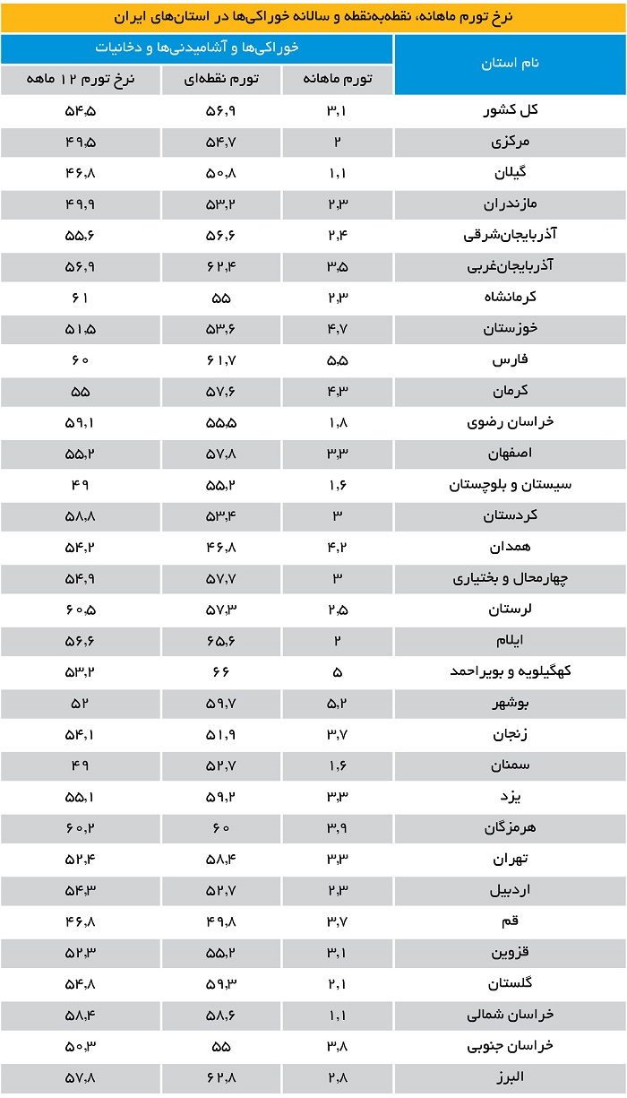به گزارش بخش اقتصادی سایت خبرمهم ، تازه‌ترین روایت مرکز آمار ایران نشان می‌دهد که از ۵۳ قلم خوراکی منتخب، تعداد ۳۸ قلم کالا، درصد تغییر سالانه بالاتر از نرخ تورم نقطه‌ای کل کشور را تجربه کرده و نرخ تورم سالانه در مناطق روستایی ۱۰ استان کرمانشاه، یزد، فارس، همدان، خراسان شمالی، بوشهر، کردستان، ایلام، خراسان رضوی و لرستان به بالای ۵۰ درصد رسیده است.