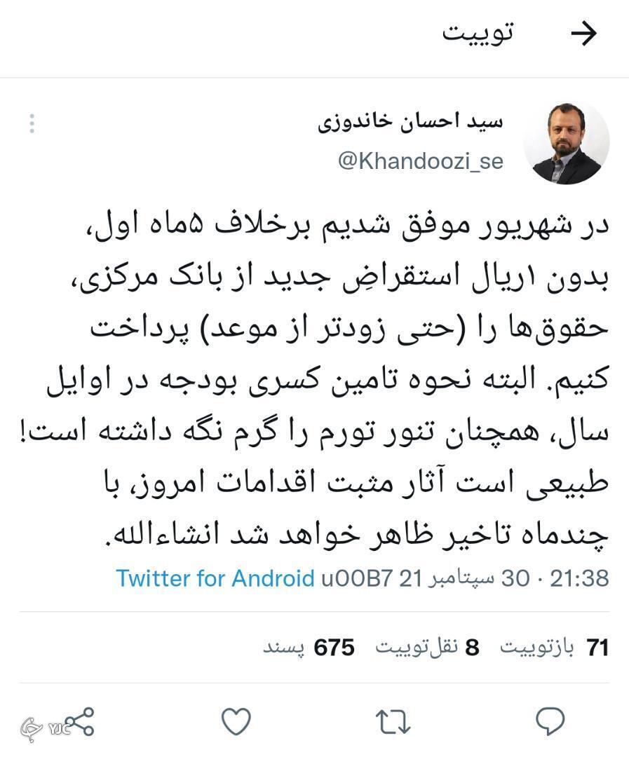 به گزارش بخش اقتصادی سایت خبرمهم ، بعد از انتشار صورت های مالی بانک ها و شرکت های دولتی که یک ماه پیش وزیر اقتصاد وعده آن را داده بود، در روزهای قبل شاهد خبر جدیدی از سوی وزارت اقتصاد بودیم. وزیر جدید اقتصاد با تاکید بر دولتی مردمی - ایرانی قوی، ادعا کرده که در شهریور ماه بدون ۱ ریال استقراض از بانک مرکزی حقوق ها را پرداخت کردیم. خاندوزی این پیروزی را با این جمله ادامه می دهد که؛ نحوه تامین کسری بودجه در اوایل سال، همچنان تنور تورم را گرم نگه داشته است!