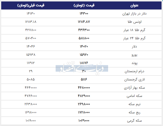 دلار در بازار امروز تهران، به ۱۴,۳۰۰ (چهارده هزار و سیصد ) تومان رسید که نسبت به دو روز پیش، افزایش ۱.۱۸ درصدی داشته است.