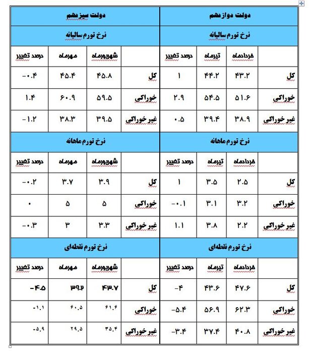 براساس اعلام مرکز آمار نرخ تورم سالیانه در خردادماه ۴۳.۲ درصد و تیرماه ۴۴.۲ درصد بود. براین اساس نرخ تورم سالیانه کل کشور در دو ماه پایانی خدمت دولت گذشته یک درصد رشد داشت. همچنین در این بازه زمانی نرخ تورم خوراکیها ۲.۹ درصد و اقلام غیرخوراکی و خدمات ۰.۵ درصد رشد داشت.
