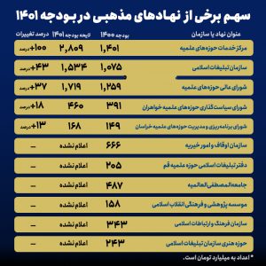 در جدول زیر ۱۰ سازمان و موسسات مذهبی که در بودجه ۱۴۰۰ بیشترین بودجه را گرفته بودند، نوشته شده است. بودجه سازمانهای اوقاف و امور خیریه، فرهنگ و ارتباطات اسلامی و موسساتی مانند جامعهالمصطفی العالمیه، دفتر تبلیغات اسلامی حوزه علمیه قم، حوزه هنری سازمان تبلیغات اسلامی و… در لایحه بودجه ۱۴۰۱ اعلام نشده است. /تجارت نیوز