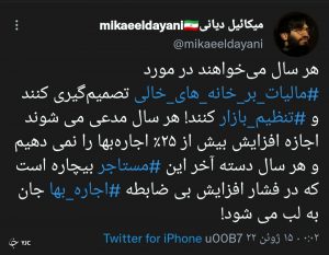 در مقابل آن یکی از مشاوران املاک در منطقه ۱۱ هم گفت: بازار مسکن در تمامی مناطق تهران با نوسان روبرو است و هیچ مالکی راضی نمی شود که نرخ اجاره و مصوب ۲۵ درصد را قبول کند.