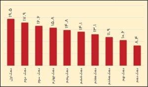 درصد تغییر ماهانه شاخص کل تورم بر دهکهای مختلف