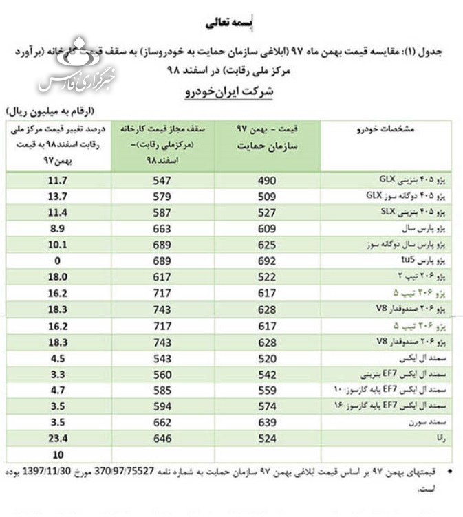 جزئیات قیمت های تعیین شده از سوی شورای رقابت برای محصولات ایران خودرو و سایپا را منتشر کرد که این قیمت ها بر اساس قیمت تمام شده خودرو و با توجه به نرخ تورم مشخص شده بود. بر اساس این جداول و همانطور که در ستون آخر هر کدام از جدولها آمده است، قیمت محصولات ایران به طور متوسط ۱۰ درصد و قیمت محصولات سایپا به طور متوسط ۲۳ درصد افزایش یافته و قیمت محصولات ایران خودرو هم به طور متوسط ۱۰ درصد رشد داشته است.
