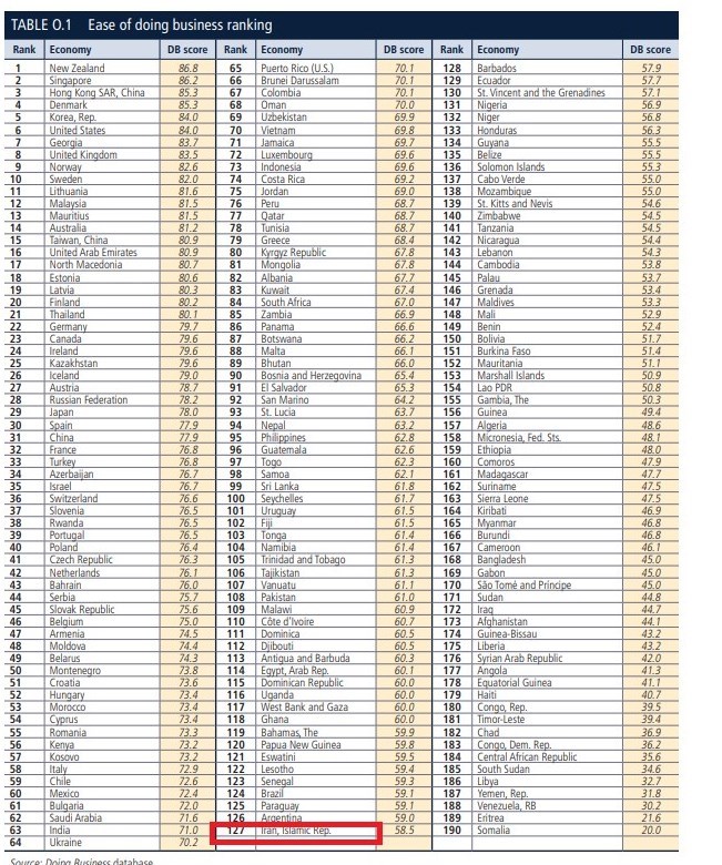 بر اساس این گزارش در رده بندی جهانی، رتبه ایران از نظر سهولت آغاز کسب‌وکار ۱۷۸، کسب مجوز ۷۳، ثبت داراییها ۷۰، کسب اعتبارات ۱۰۴، حمایت از سرمایه گذاری ۱۲۸، مالیات ۱۴۴، تجارت ۱۲۳، اجرای قراردادها ۹۰ ، ورشکستگی ۱۳۳ و دریافت انرژی برق ۱۱۳ محاسبه شده است.