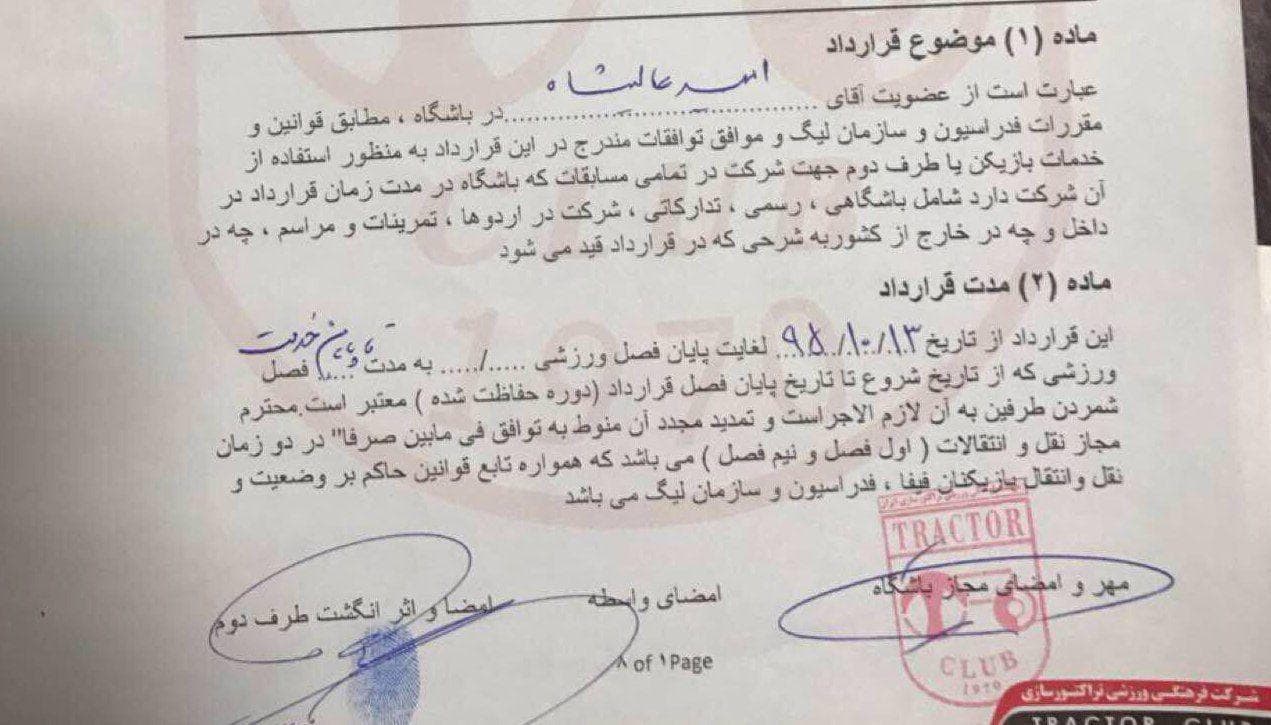 مدارک قرارداد امید عالیشاه توسط نظام وظیفه و فدراسیون فوتبال تایید شده و بعید است که شکایت السدى ها براى پرسپولیس دردسرساز شود