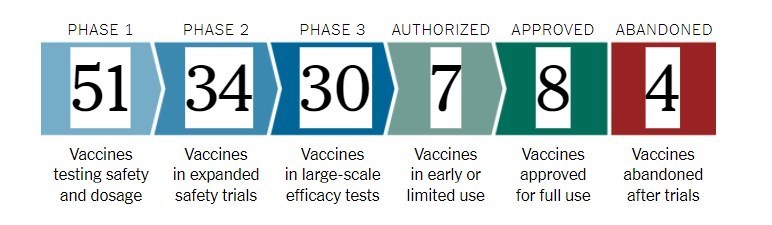 در همین راستا، کمیته ساماندهی تحقیقات کووید۱۹ در معاونت تحقیقات وزارت بهداشت، گزارشی از روند تولید و توسعه واکسنهای کرونا در ایران و جهان را منتشر کرده است؛ طبق این گزارش هماکنون بیش از ۲۰۰ واکسن در جهان در مراحل مختلف توسعه و ارزیابی میباشند. آخرین وضعیت واکسنهای این بیماری در دنیا تا تاریخ ۴ خرداد ۱۴۰۰ در تصویر زیر نشان دادهشده است.