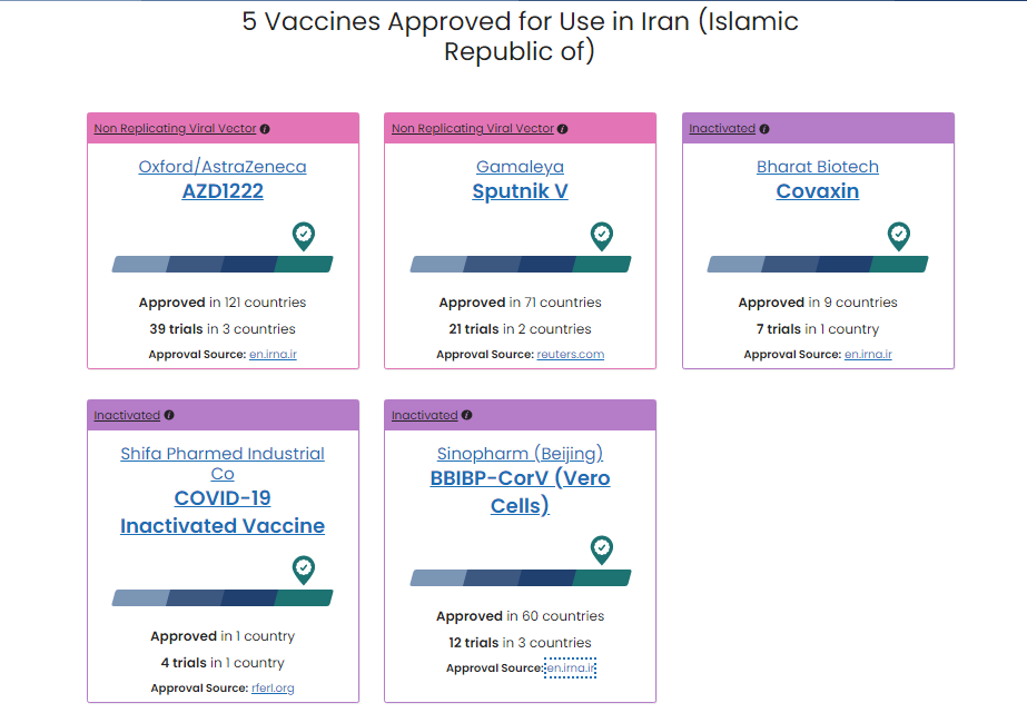 براساس اخبار منتشر شده در ماه‌های گذشته، تاکنون ۵ واکسن مجوز سازمان غذاودارو ایران را گرفته‌اند که واکسن سینوفارم BBIBP-CorV هم در بین آن‌ها وجود دارد: