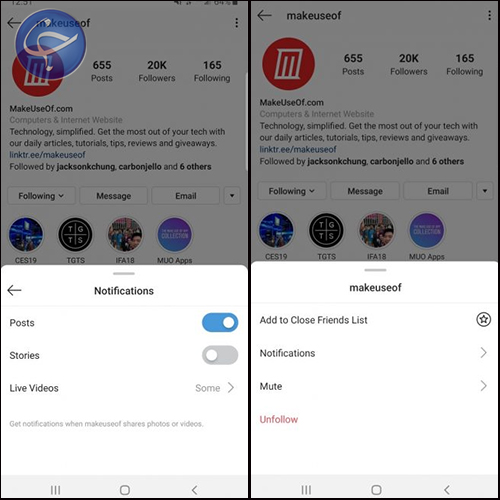 فعال کردن اعلان کلی اینستاگرام معمولا روش مناسبی برای با خبر شدن از پستهای جدید نیست، در این حالت به محض ارسال پست یا استوری تمامی افرادی که دنبالشان میکنید، با اعلان به شما خبر داده میشود و به این صورت در طول روز مدام اعلانهای اینستاگرام را دریافت خواهید کرد، اما گاهی برخی کاربرانی که دنبالشان میکنید برایتان اهمیت بیشتری دارند و تنها میخواهید اعلان ارسال پست یا استوری جدید آن کاربران را دریافت کنید، برای این کار دو روش وجود دارد، اول آن که به صفحه آن کاربر مورد نظر بروید، بر روی منو کشویی Following که زیر بخش توضیحات پروفایل قرار دارد، لمس کنید، از منو باز شده Notifications را انتخاب کرده و مطابق شکل زیر میتوانید اعلانهای ارسال پست، استوری و لایو ویدیو را به صورت جداگانه فعال کنید.