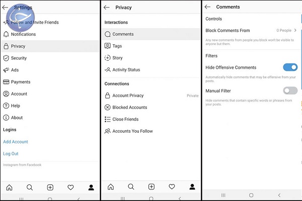 متاسفانه فحاشی و توهین در اینستاگرام به امری بدهی تبدیل شده است، برخی کاربران تنها با هدف توهین به دیگران وارد شبکههای اجتماعی میشوند و با نظرات نامناسب خود، محیط این شبکهها را آلوده میکنند، اما اینستاگرام برای رفع این مشکل گزینهای برای فیلتر کامنتها (نظرات) تعبیه کرده است، برای این کار به مسیر Settings > Privacy > Comments رفته و گزینه Hide Offensive Comments را انتخاب کنید، حال میتوانید در بخش Manual Filter با وارد کردن کلمات نامناسب، آنها را در نظرات زیر پست خود پاک کنید.