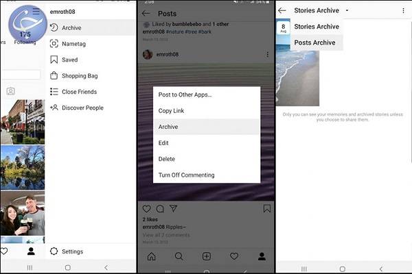 بایگانی کردن یک پست به معنای حذف آن در حساب کاربری شما است، در واقع اگر میخواهید تنها یک یا چند پست ارسالی خود را از معرض دید همگان خارج کنید باید آنها را به بخش آرشیو انتقال دهید، در این بخش مجددا میتوان پستها را بازنشر کرد، برای این کار به پست مورد نظر رفته و از میان گزینههای منو آپشن در قسمت بالا سمت راست صفحه، Archive را انتخاب کنید، زمانی که میخواهید پستهای آرشیو شده خود را ببینید، از منو سهخطی پروفایلتان گزینه Archive و سپس Posts را انتخاب کنید.