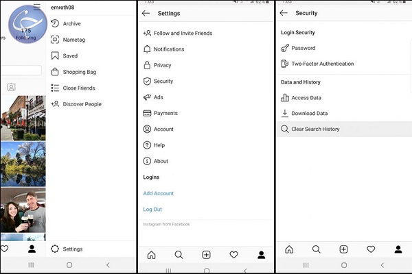 جستوجو موارد مختلف در اینستاگرام یک کار شخصی است و گاهی مقابل دیگران این موارد جستوجو به نمایش در میآید که احساسی ناخوشایند برای افراد دارد، اینستاگرام قابلیتی دارد که با آن میتوان تمامی تاریخچه جستوجوهای این شبکه اجتماعی را پاک کرد، برای این کار به صفحه پروفایل خود بروید و با انتخاب منو سه خطی در بالا، گزینه Settings را که در قسمت پایین منو نمایش داده شده انتخاب کنید، سپس گزینههای Security و در ادامه Clear Search History را لمس کنید تا تمامی تاریخچه جستوجوهای شما در اینستاگرام پاک شود.