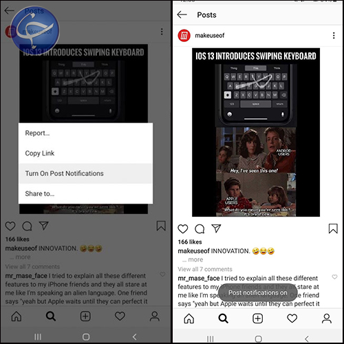 راه حل دوم آن است که مستقیما از یکی از پستهای فرد مورد نظر بر روی سه نقطه سمت راست گوشه تصویر لمس کنید و از میان گزینهها Turn On Post Notifications را انتخاب کنید. برای غیرفعال کردن اعلانهای افراد نیز با استفاده از همین روش و انتخاب Turn Off Post Notifications استفاده کنید.