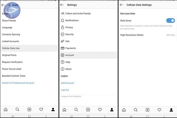 یکی از مضرات اینستاگرام، حجم بالا اینترنت مصرفی این شبکه اجتماعی است که در طول ماه هزینه خرید اینترنت را به شدت افزایش میدهد، برای جلوگیری از این اتفاق گزینهای برای محدود کردن حجم مصرفی وجود دارد، به همین جهت به منو Settings بروید و پس از انتخاب Cellular Data Use، حالت Data Saver را فعال کنید، با این کار سرعت بارگذاری تصاویر و ویدیوها کمی کاهش مییابد اما در عین حال حجم مصرفی اینترنت نیز به مقدار قابل توجهی کاسته میشود.