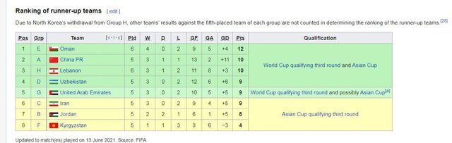 اگر اردن مقابل استرالیا پیروزی شود و ازبکستان مقال عربستان به پیروزی یا تساوی دست یابد، در این صورت فقط با شکست خوردن امارات مقابل ویتنام، ایران میتواند صعود کند.