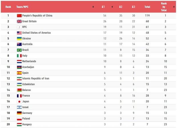 جدول رده بندی توزیع مدال ها تا پایان روز ششم بازیهای پارالمپیک