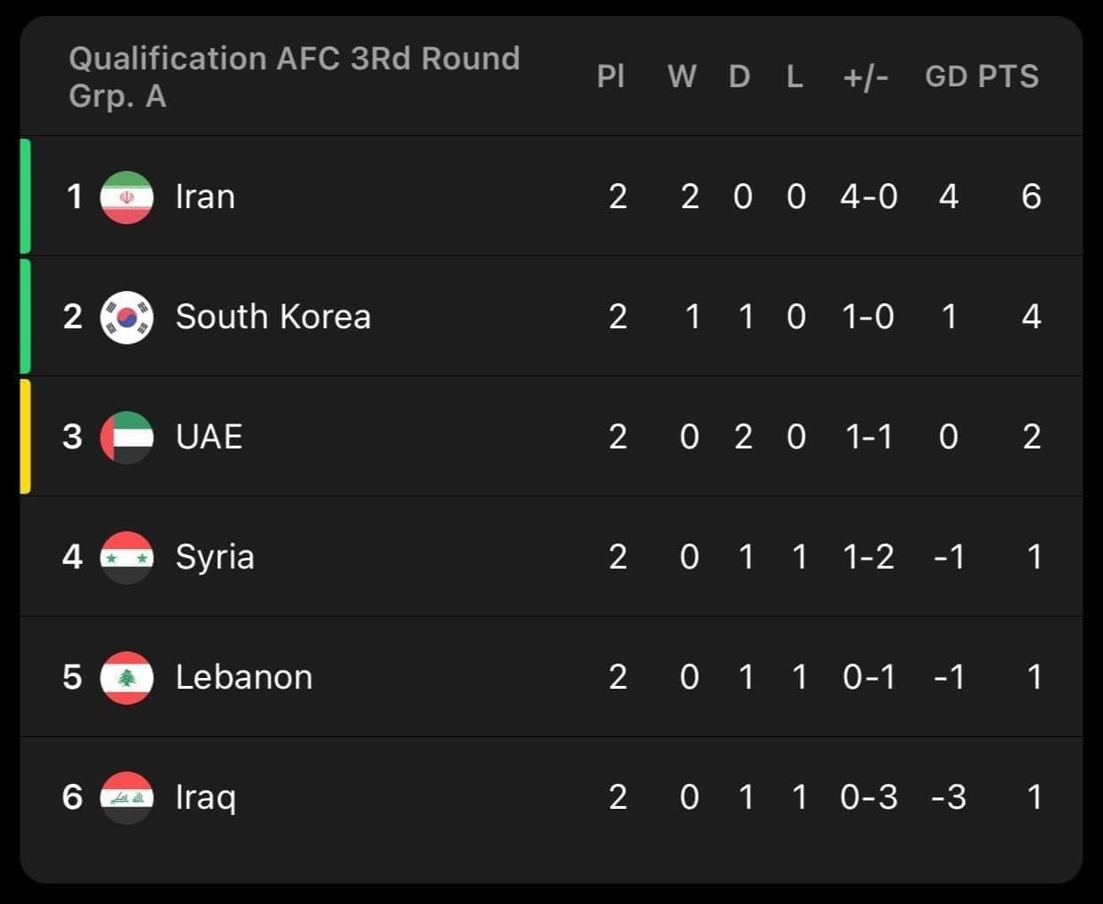 جدول رده بندی گروه A مقدماتی جام جهانی _ آسیا پس از پایان روز دوم /جماران