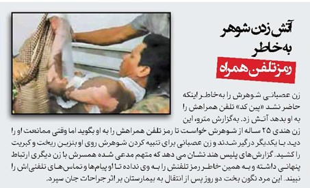 گزارشهای پلیس هند نشان می دهد که متهم مدعی شده همسرش با زن دیگری ارتباط پنهانی داشته و به همین خاطر رمز تلفنش را به وی نداده تا او پیامها و تماسهای تلفنیاش را نبیند. این مرد نگون بخت دو روز پس از انتقال به بیمارستان بر اثر جراحات جان سپرد. /ایران