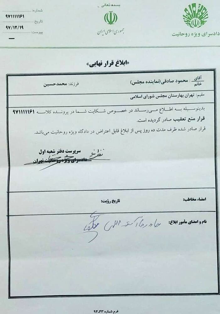به گزارش بخش قضایی سایت خبرهای فوری ، محمود صادقی نماینده مردم تهران درباره نتیجه شکایت خود از صادق آملی لاریجانی در توئیتر نوشت: دادگاه ویژه روحانیت در خصوص شکایت اینجانب از آقای صادق آملی لاریجانی مبنی بر ایراد توهین و افترا به اینجانب در سخنرانی ایراد شده در همایش فرماندهان بسیج دستگاه قضایی (منتشر شده در تاریخ ۳ آذر ۹۵ در خبرگزاری میزان) قرار منع تعقیب صادر کرد.